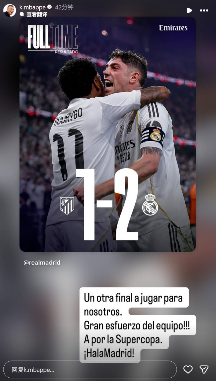 本场伤缺的姆巴佩在社媒晒出球队取胜海报,配文写道:“我们还有一场比赛要取胜,全队付出的努力太棒了,让我们拿下西班牙超级杯,皇马加油!”