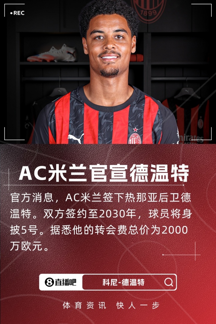 08月13日讯 官方消息,AC米兰签下热那亚后卫德温特。双方签约至2030年,球员将身披5号。