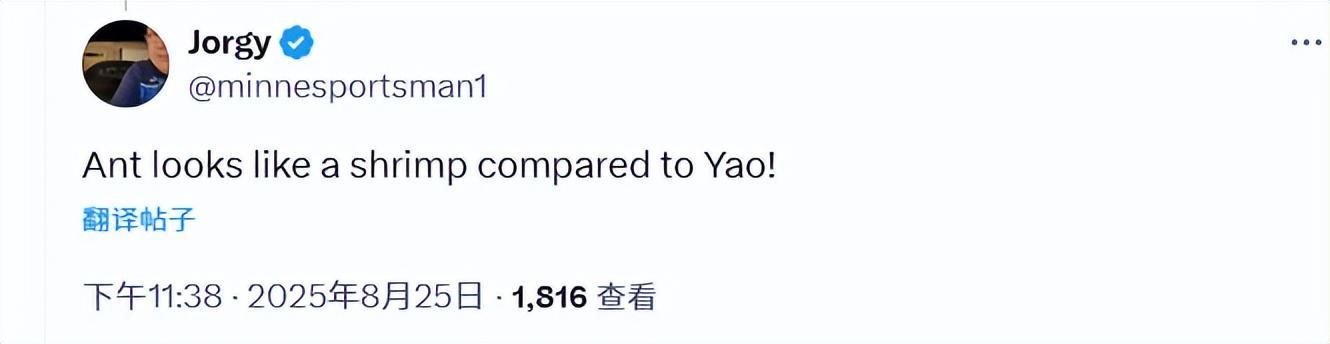 爱德华兹和姚明的合影也引起球迷们的热议。有球迷写道:“和姚相比,他看上去就像小虾米。”还有球迷写道:“爱德华兹站在身边就像一个球迷。”更有球迷相信爱德华兹能在新赛季隔扣文班亚马。